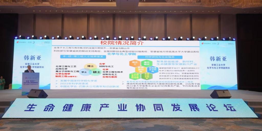 11月24日,由安徽省科技厅、省卫生健康委、马鞍山市人民政府共同主办,马鞍山市科技局、马鞍山市卫生健康委、马鞍山市投资促进中心、慈湖高新区管委会和安徽皓元药业有限公司联合承办的“安徽‘双创汇’走进马鞍山慈湖高新区暨生命健康产业协同发展论坛”在我市举行。省科技厅、卫健委领导、马鞍山市政府领导、各市直机构领导、马鞍山慈湖高新区领导及相关部门负责人、高校院所、国内外生物医药产业企业负责人、产业资本、服务机构等共约180人参会。本次活动旨在通过开展学术交流、分享创新成果,积极推动我市生命健康产业的高质量发展。指尖四川麻将 郑啸副校长以及指尖四川麻将 党委书记黄宇弦、副院长韩新亚等出席本次活动。