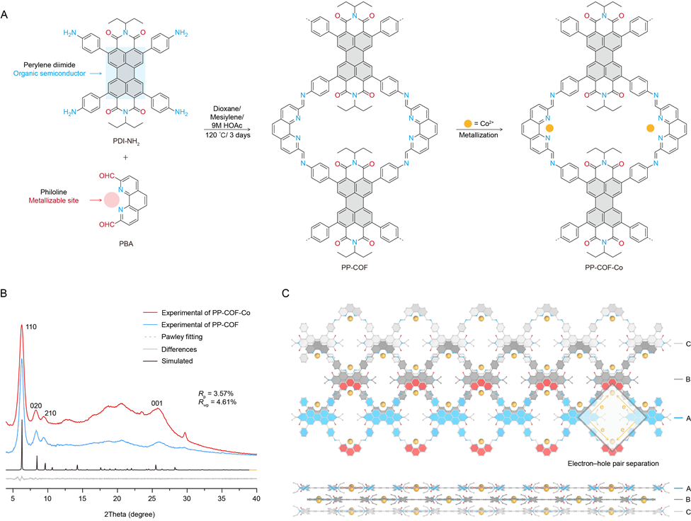 图1:钴金属化一维苝二酰亚胺共价有机框架PP-COF-Co的合成