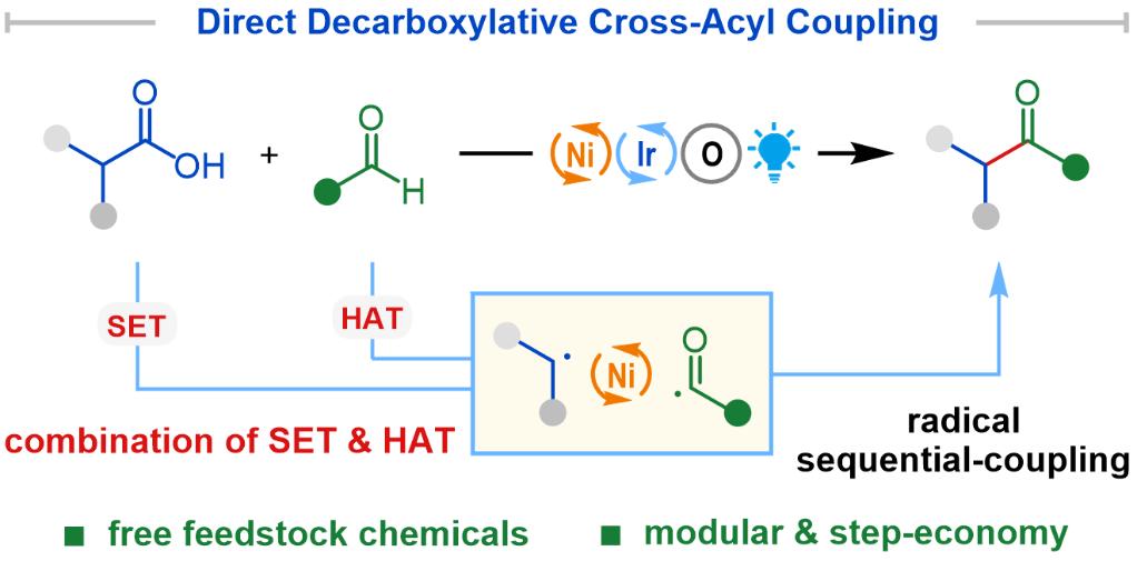 羰基化合物是生物活性分子、精细化学品和有机功能材料中普遍存在且具有独特优势的结构单元,其中酮类化合物是最重要的组成部分之一。在酮类化合物的合成方法中,传统过渡金属催化的酰基化偶联反应通常需要使用酰氯、酸酐等活化酰基化试剂,这极大地限制了其在实际生产中的应用。近年来,光-金属协同催化是一种融合了光氧化还原和过渡金属催化的新型催化模式,可以在温和条件下实现化学键的构筑,其中现有光-金属协同催化的交叉酰基偶联反应往往需要使用活化试剂或预活化步骤。从原子和步骤经济性角度考虑,如果发展由廉价易得的大宗化学品出发直接获取非对称酮的交叉酰基偶联反应将具有重要的意义和价值,但极具挑战性。