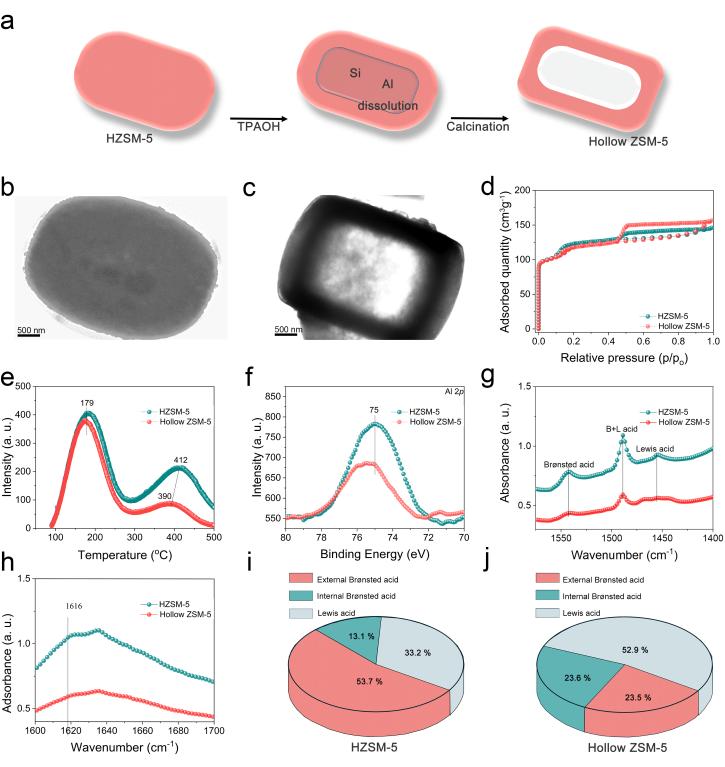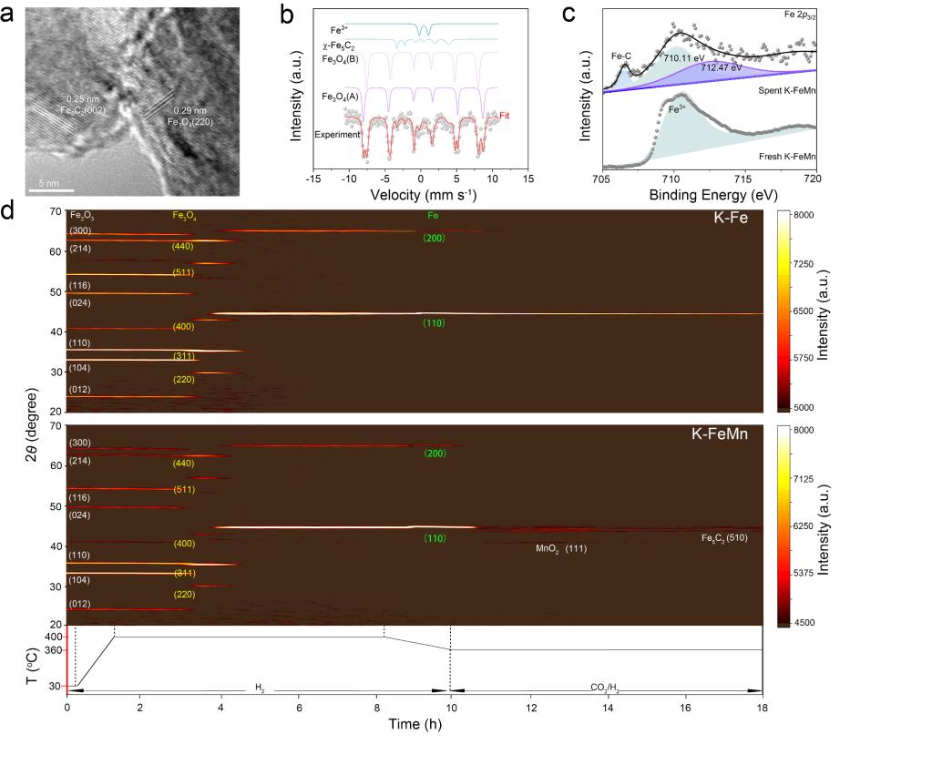 机理研究表明,钾和锰改性的铁基材料促进了轻烯烃中间体的形成,而中空结构ZSM-5具有钝化的外表面酸位点,能有效抑制对二甲苯的异构化和烷基化反应并能促进对二甲苯的扩散,使二甲苯中对二甲苯比例达到65.1%。本研究通过特定催化剂设计和空间分离工艺,克服了局部热力学平衡,为可持续且高效的对二甲苯生产开辟了新途径。