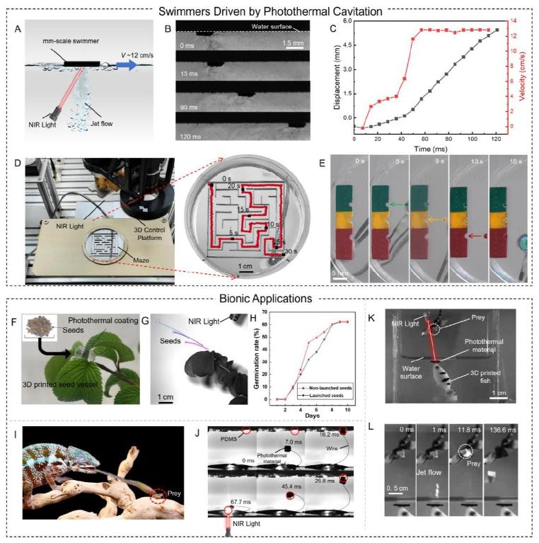 空化(Cavitation)通常指液体在低压或高温区域产生蒸汽泡的现象,气泡在溃灭瞬间可释放巨大能量,而传统上认为空化具有一定的破坏性,会对水力机械产生空蚀。本研究通过精确调控,利用光照可将空化效应转化为一种高效的动力来源,用于驱动微型执行器与机器人系统。在基于空化效应的高效、爆发式驱动机制下,我们成功展示了其在微型跳跃与游泳机器人以及多种仿生应用中的卓越性能。