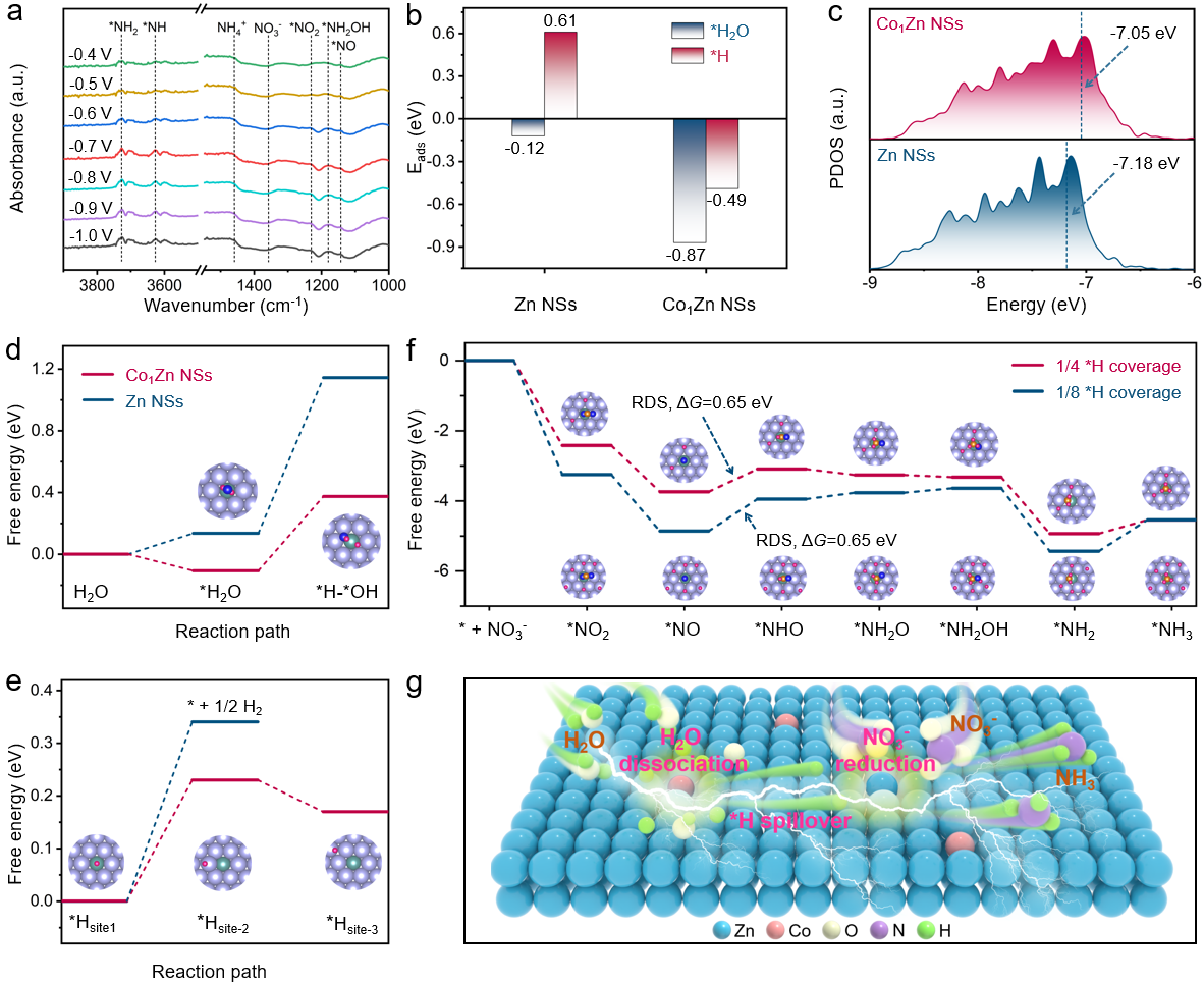 为了解决这一难题,曾杰教授团队通过精巧的单原子合金设计,开发了一种Co1Zn非贵金属氢溢流体系,成功的解决了电催化硝酸盐还原合成氨反应中活性氢的供应难题。凭借该催化体系中显著的氢溢流效应,在安培级电流密度下实现了硝酸盐到氨的高效催化转化。在流动电解池中,实现了高达2.4 A cm⁻2的合成氨反应电流密度和204.5 mg h⁻1cm⁻2的产氨速率,性能远超未形成氢溢流效应的Zn纳米片催化剂。此外,基于该催化剂组装的Zn-NO3⁻可充电电池展现出优异性能,可以稳定的输出1.39 V的电压和5.51 mW cm-2的峰值功率密度。本研究揭示了非金属合金体系中氢溢流机制的可行性,为电催化氢化反应的催化剂设计提供了一种新思路。(撰稿:刘明凯 审核:韩新亚 黄宇弦)