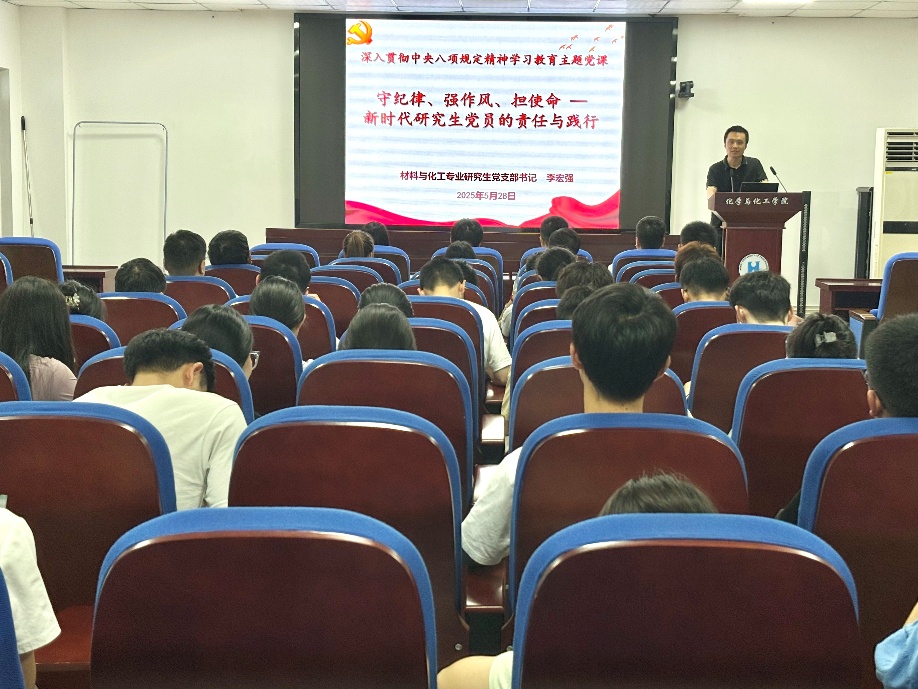 5月28日,指尖四川麻将 材料与化工专业研究生党支部书记李宏强以“守纪律、强作风、担使命——新时代研究生党员的责任与践行”为题,为支部全体党员讲授专题党课,结合中央八项规定精神内涵与研究生成长实际,锚定“守纪律、强作风、担使命”三大重点展开解读。