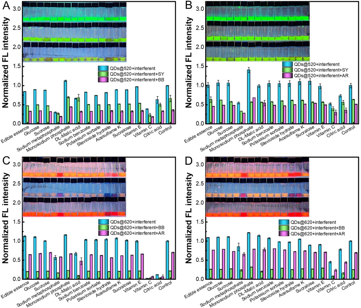 (绿色和橙红色QDs在不同浓度下对常见食品添加剂的荧光抗干扰性能)