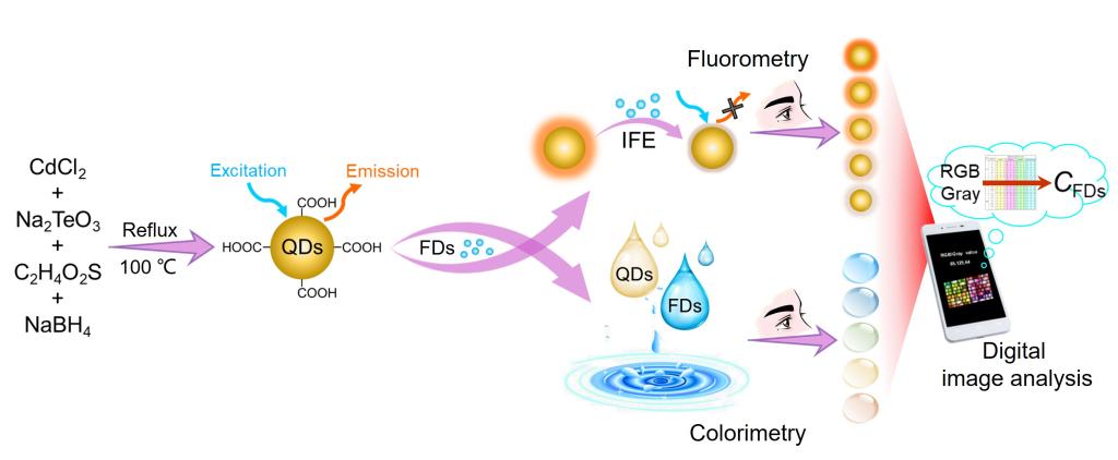 丰富的不饱和结构使得FDs通常具有强的紫外-可见光吸收能力,而大多数FDs本身不具备荧光发射行为,考虑到FDs的荷电性质,课题组利用羧基带帽CdTe量子点(QDs)设计开发了基于内滤效应(IFE)的通用型FDs多模可视化平台用于FDs的裸眼半定量即时检验,包括QDs试剂盒和QDs掺杂的荧光检测试纸等。由于IFE检测体系具有浓度依赖性,仅依靠FDs的光吸收性质与QDs的荧光激发/发射带之间的谱学重叠即可实现荧光响应,无需FDs与QDs之间发生直接的相互作用,因此荧光响应过程可在瞬间完成,使得整个检测过程在10 s(试剂盒)或1 min(试纸)内便可结束。不同于传统单一信号源的可视化方法,集表观颜色、荧光颜色和智能手机数字化图像分析技术于一体的多模可视化分析技术,其各分析通道可单独运行,亦可多模协同工作,这种不同分析通道间分析结果的相互验证大大提高了可视化分析技术的可行性与可靠性,实验证明多模可视化技术的直读结果与多种经典仪器分析技术的测定结果高度吻合。